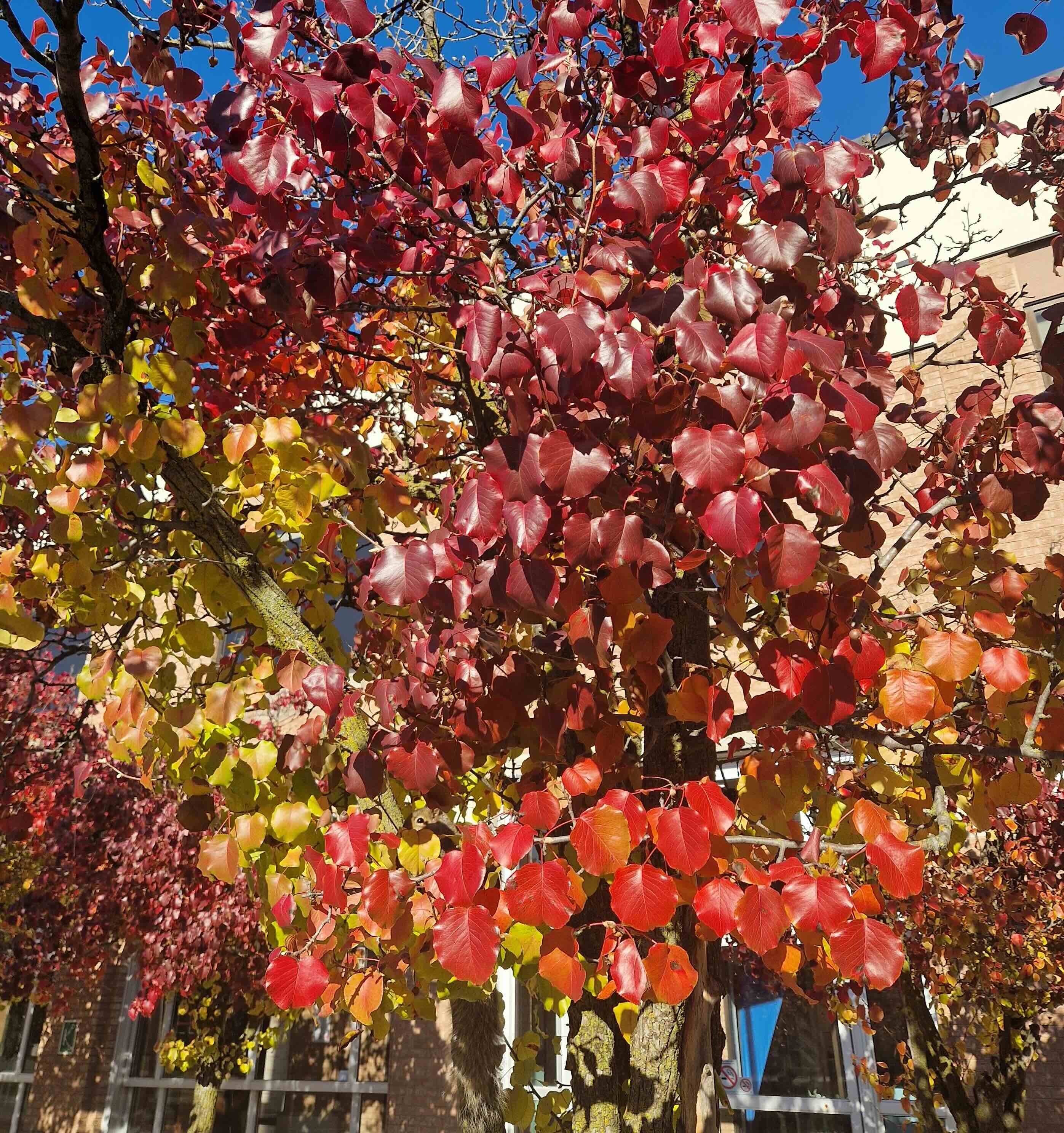 This robust looking tree has big thick leaves, and is still holding wonderfully colour. I think this is a callery pear, an ornamental relative of edible pears. Still stunning.