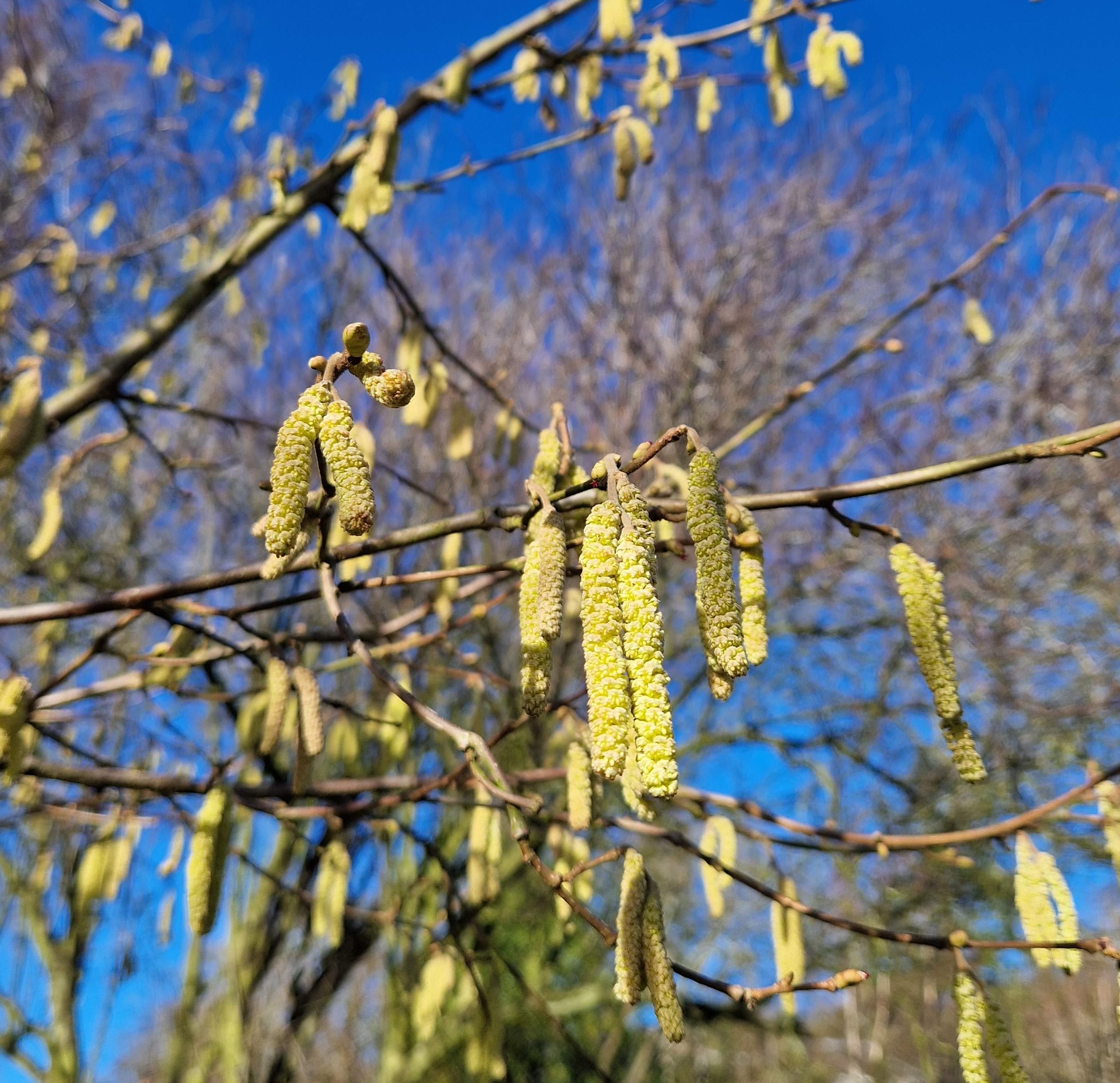 Last, just look at this late winter blue, blue blue sky, with hazelnut catkins blazing away in the sunshine. Here’s the love!