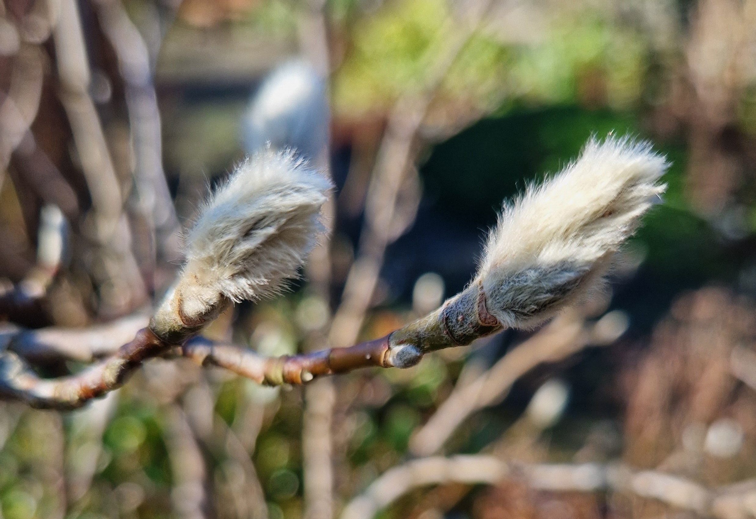 Lit by the sun, those magnolia buds that always take forever to open are looking more and more promising….properly furry this weekend.