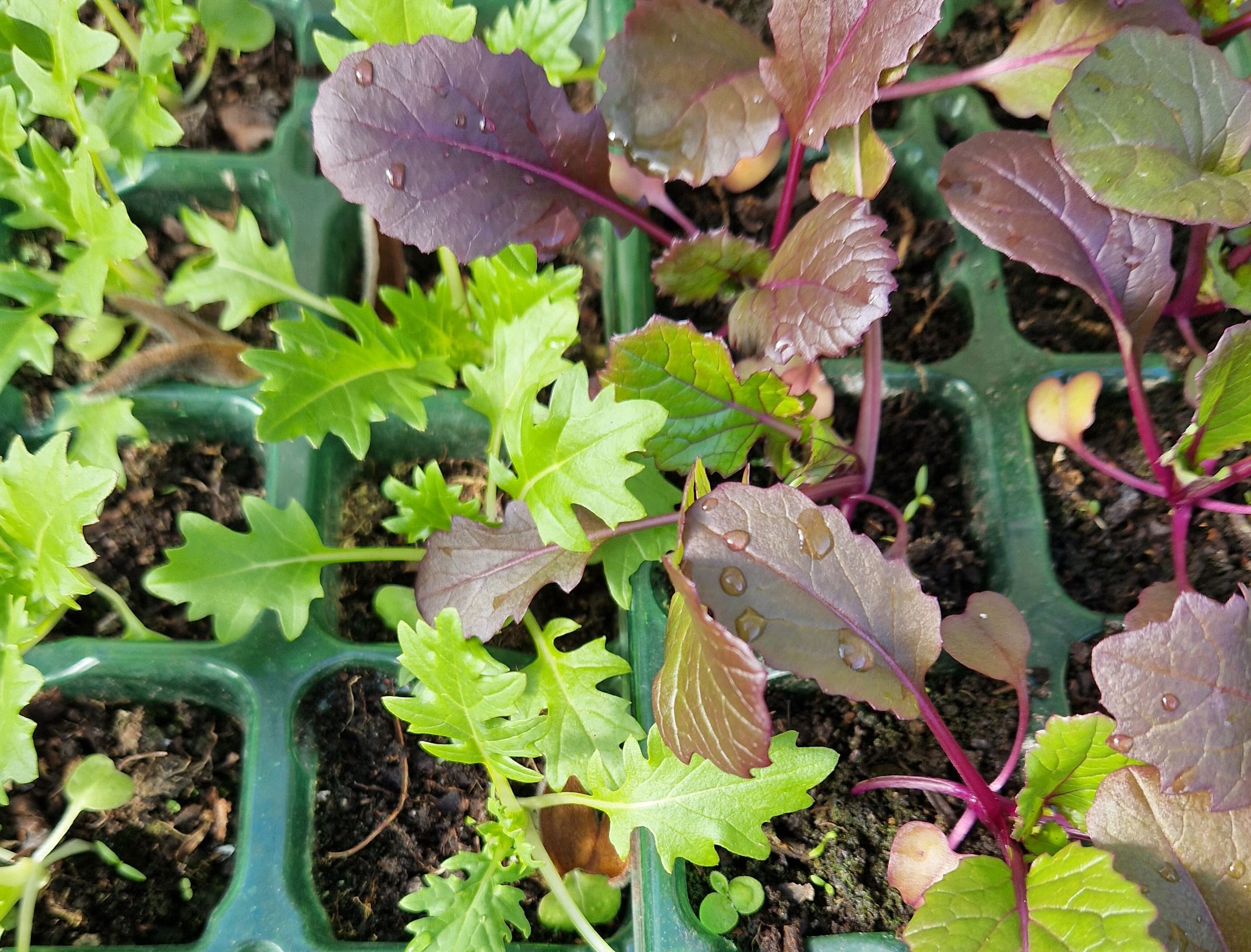 There’s been action finally in the veg bed. I grew some red oak choi, and some mizuna, in little pots in the greenhouse. I hope there are plenty of hungry birds around now, because I just put this lot out into the garden. Those birds will be needed to take care of the slugs.