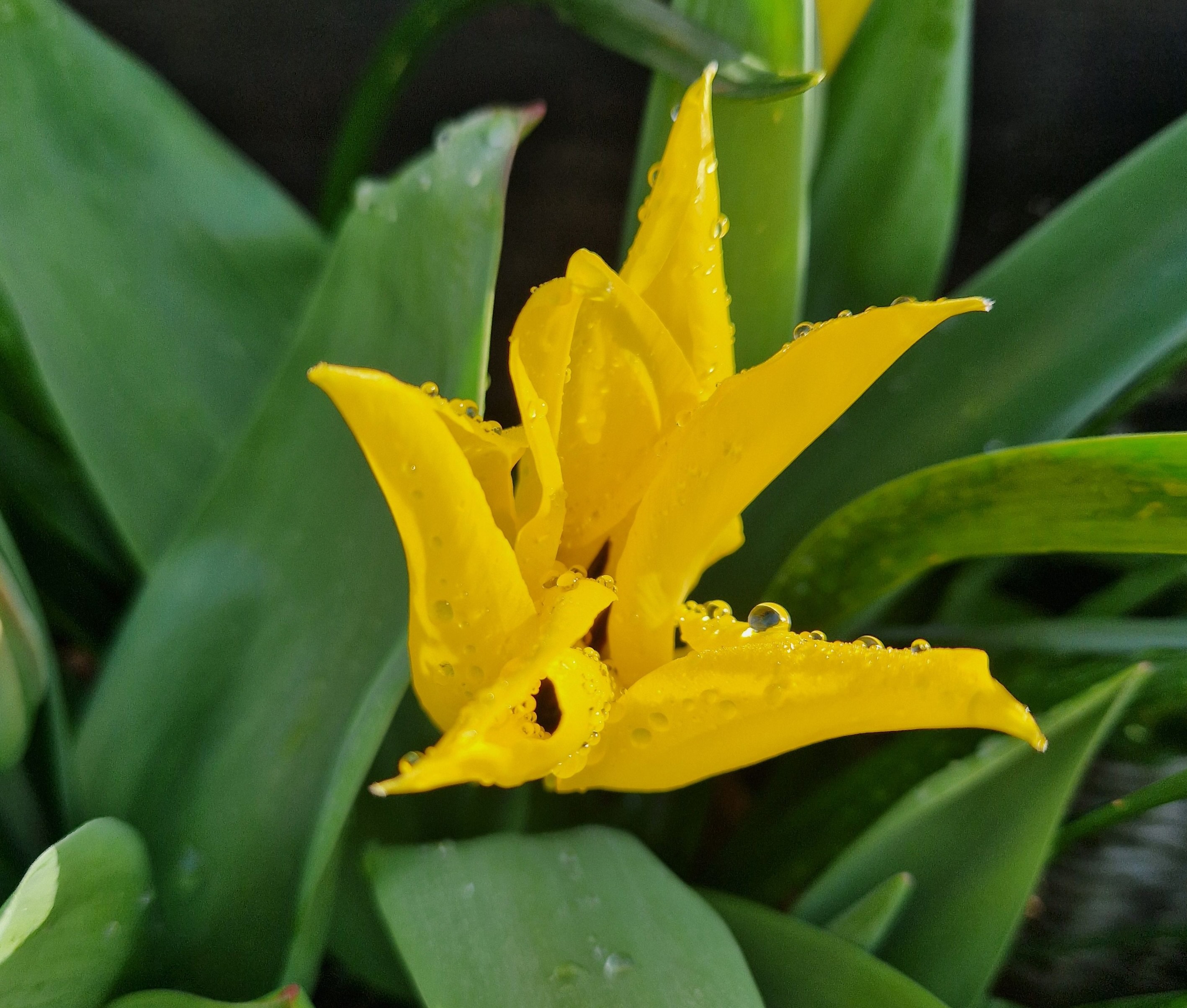 In pots in the garden, I’m now a fan of tulips like this one, with pointed and slightly twisted petals. They seem to bear wind and rain better than the goblet-shaped ones.