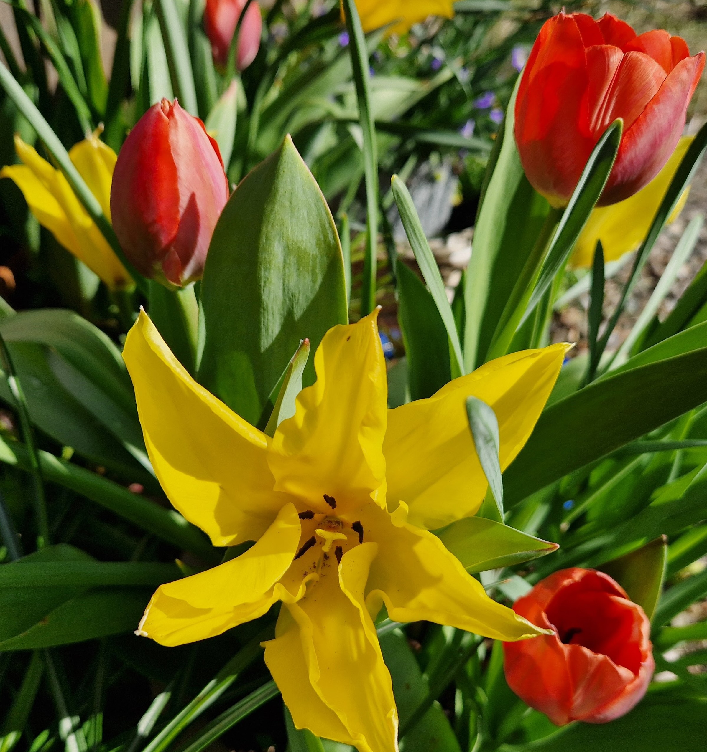 This year I planted mixtures of different tulips in pots. I must say I’m very pleased with this yellow and red mix, with different structures. When the sun comes out, so to the flowers for a blast of spring warmth.